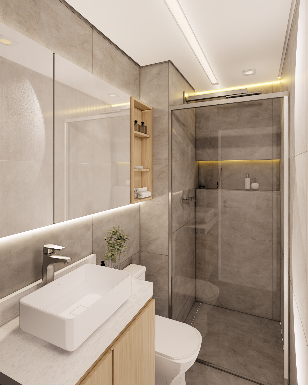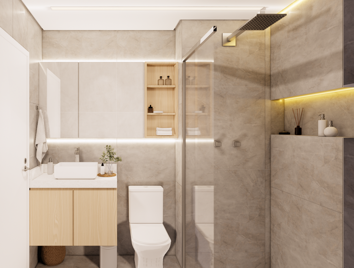 The Nidus project, with its 35m², was designed to optimize the spaces of the living room, kitchen, and bathroom, providing a clearer view of how these areas could be integrated and meet the client's needs. The living room and kitchen were designed to be functional and fluid, creating a sense of spaciousness. In the bathroom, lighting consulting was crucial to enhance the space, bringing not only more practicality but also a touch of sophistication. The project aims to maximize every square meter, creating a space that, although compact, is practical and cozy.
