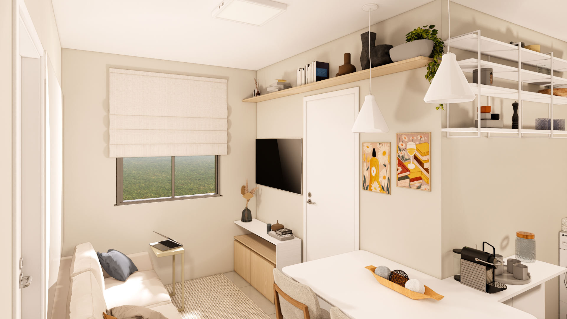 O projeto Nidus, com seus 35m², foi idealizado para otimizar os espaços da sala, cozinha e banheiro, oferecendo uma visão mais clara de como esses ambientes poderiam se integrar e atender às necessidades da cliente. A sala e a cozinha foram projetadas de maneira funcional e fluida, criando uma sensação de amplitude. Já no banheiro, a consultoria de iluminação foi essencial para valorizar o ambiente, trazendo não só mais praticidade, mas também um toque de sofisticação. O projeto visa maximizar cada metro quadrado, criando um espaço que, apesar de compacto, é prático e acolhedor.