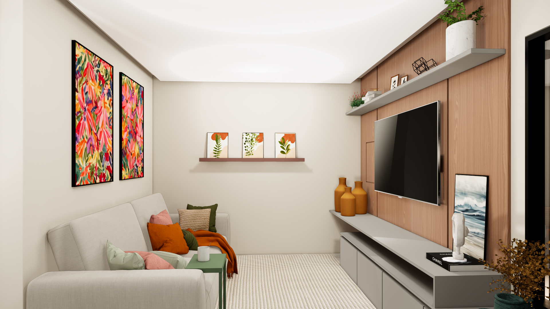 The living room was revamped with a slatted wood panel, creating an elegant backdrop for the TV and adding warmth to the space. Shelves and custom-made furniture were planned to enhance every corner, ensuring organization without losing lightness. The arrangement of vases, paintings, and details in earthy and green tones adds personality to the room.