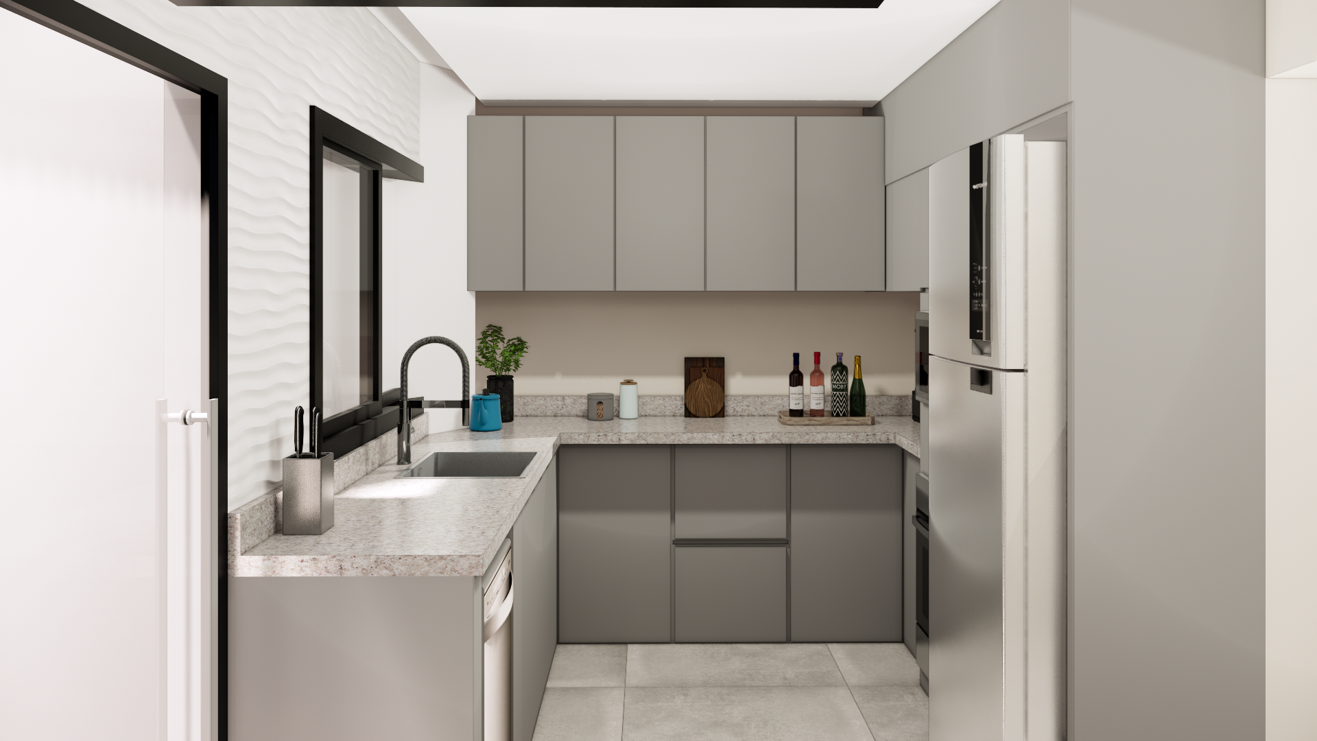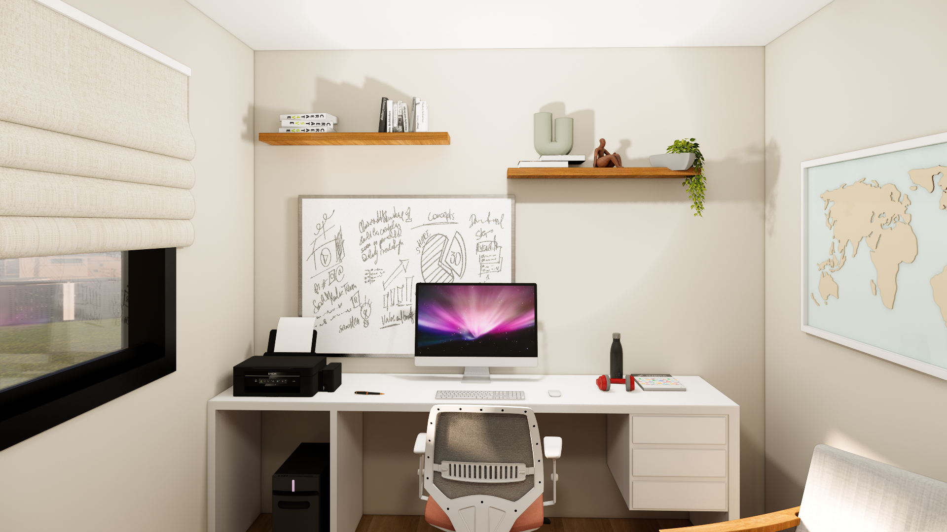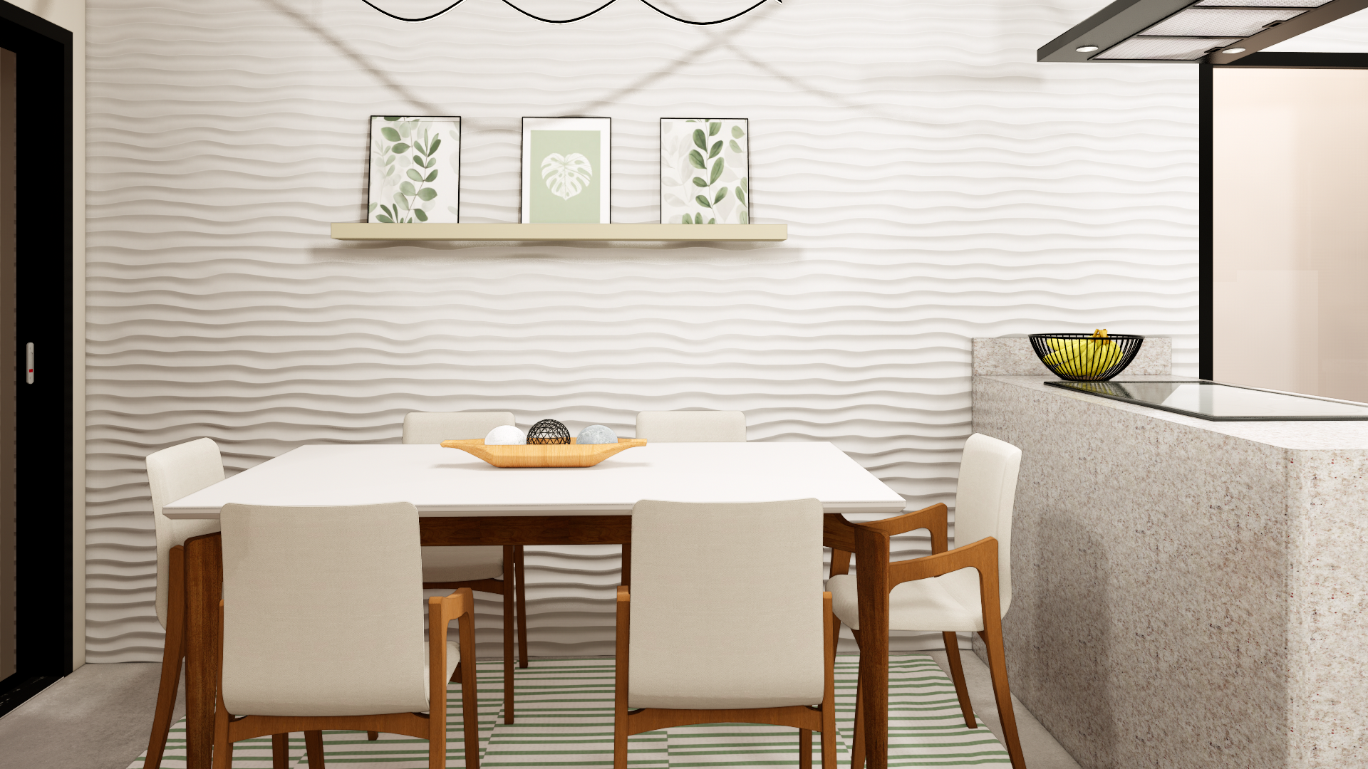 A sala de estar foi repaginada com um painel ripado em madeira, criando um fundo elegante para a TV e trazendo aconchego ao espaço. Prateleiras e mobiliário sob medida foram planejados para valorizar cada canto, garantindo organização sem perder leveza. A composição de vasos, quadros e detalhes em tons terrosos e verdes adiciona personalidade ao ambiente.