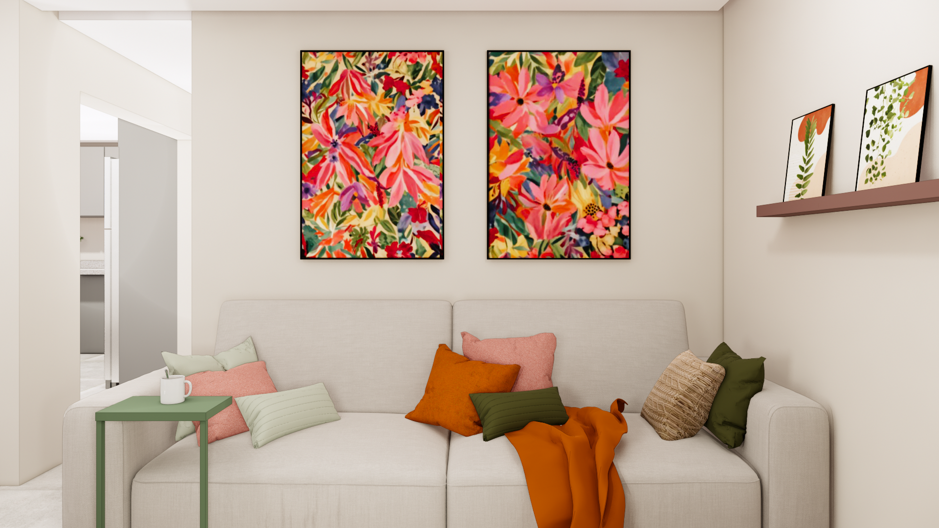 A suavidade das paredes em tons neutros contrasta com as almofadas vibrantes e texturas confortáveis, criando um espaço convidativo para relaxar. Já os detalhes decorativos, como os quadros modernos e os acessórios sutis, completam essa atmosfera charmosa e equilibrada.