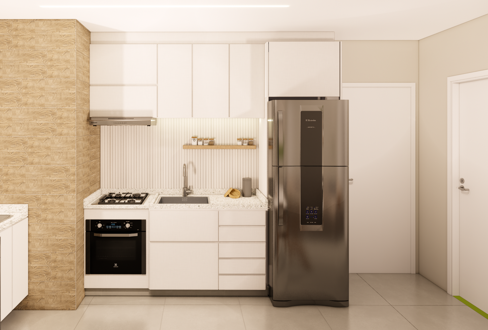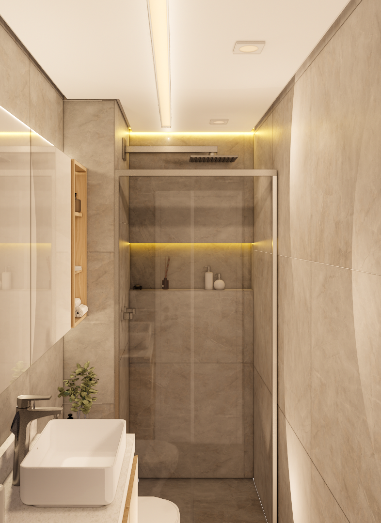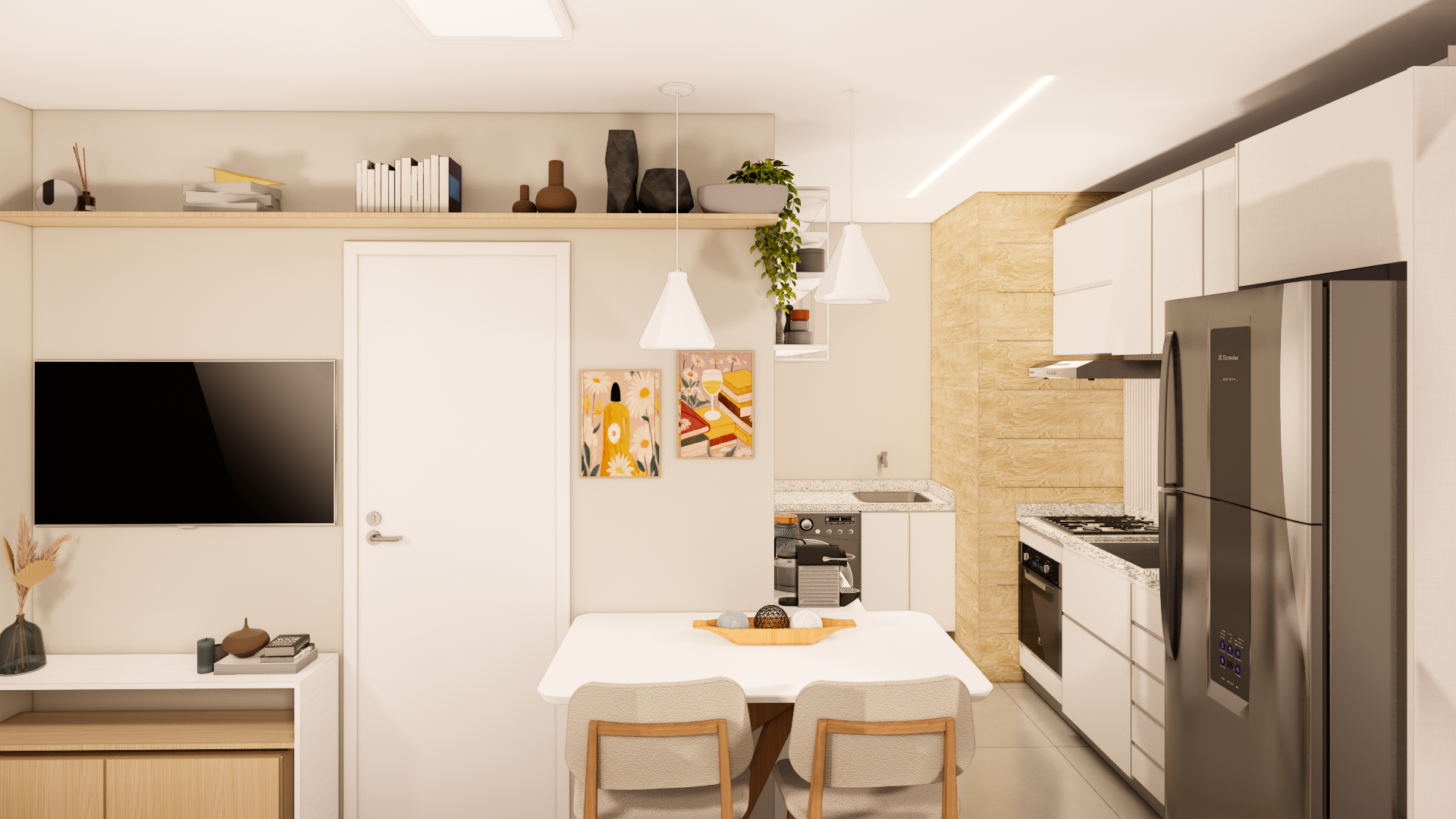 The Nidus project, with its 35m², was designed to optimize the spaces of the living room, kitchen, and bathroom, providing a clearer view of how these areas could be integrated and meet the client's needs. The living room and kitchen were designed to be functional and fluid, creating a sense of spaciousness. In the bathroom, lighting consulting was crucial to enhance the space, bringing not only more practicality but also a touch of sophistication. The project aims to maximize every square meter, creating a space that, although compact, is practical and cozy.