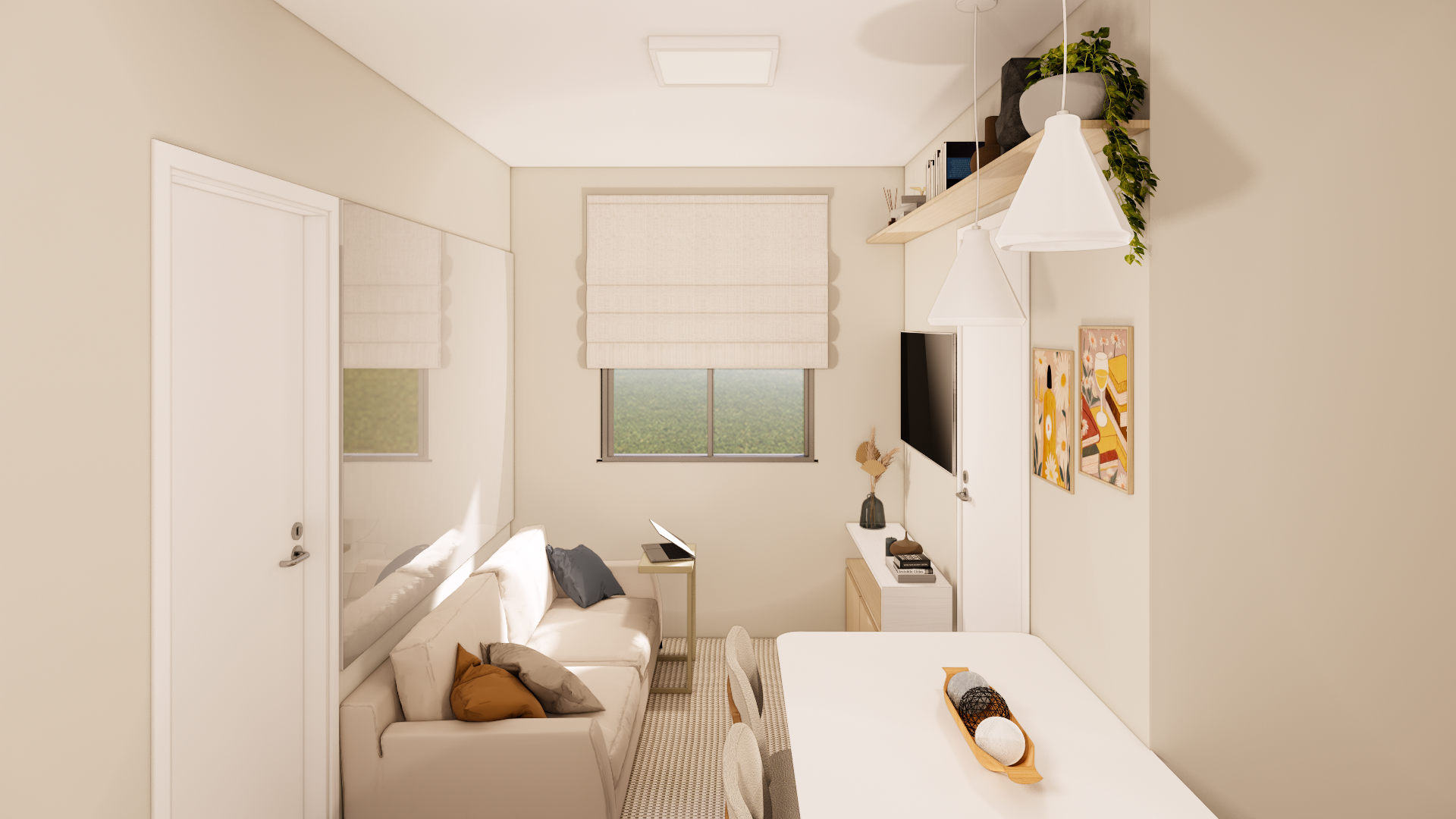O projeto Nidus, com seus 35m², foi idealizado para otimizar os espaços da sala, cozinha e banheiro, oferecendo uma visão mais clara de como esses ambientes poderiam se integrar e atender às necessidades da cliente. A sala e a cozinha foram projetadas de maneira funcional e fluida, criando uma sensação de amplitude. Já no banheiro, a consultoria de iluminação foi essencial para valorizar o ambiente, trazendo não só mais praticidade, mas também um toque de sofisticação. O projeto visa maximizar cada metro quadrado, criando um espaço que, apesar de compacto, é prático e acolhedor.