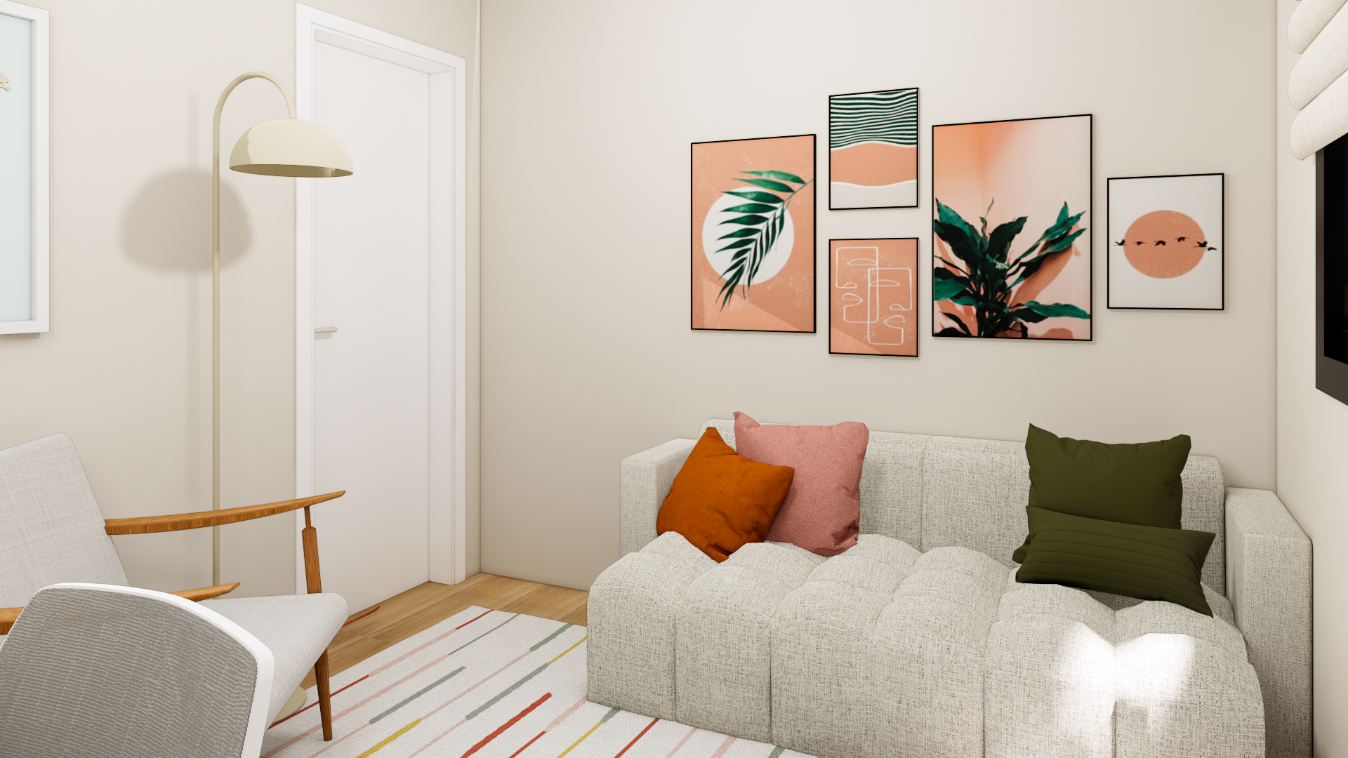 The softness of the neutral-colored walls contrasts with vibrant cushions and comfortable textures, creating an inviting space to relax. Decorative details, such as modern frames and subtle accessories, complete this charming and balanced atmosphere.