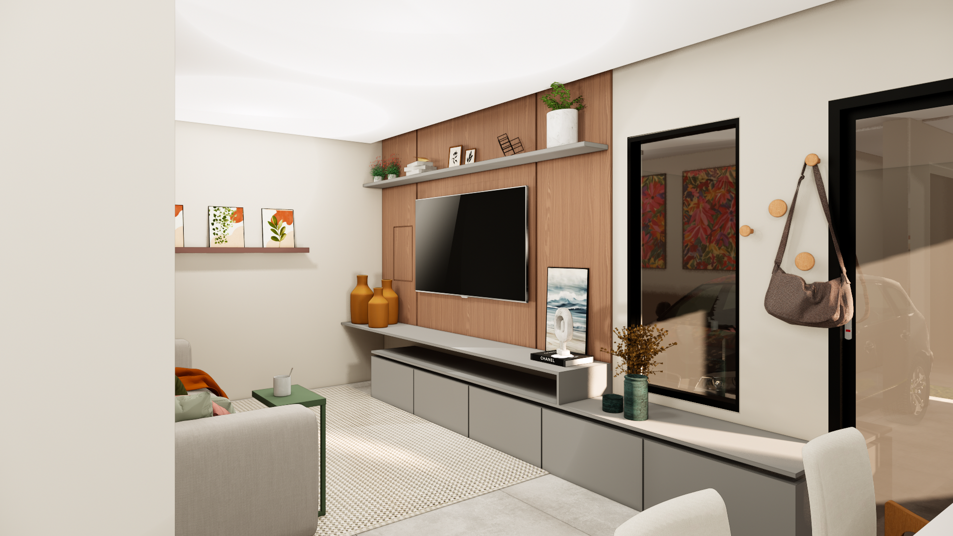 A sala de estar foi repaginada com um painel ripado em madeira, criando um fundo elegante para a TV e trazendo aconchego ao espaço. Prateleiras e mobiliário sob medida foram planejados para valorizar cada canto, garantindo organização sem perder leveza. A composição de vasos, quadros e detalhes em tons terrosos e verdes adiciona personalidade ao ambiente.